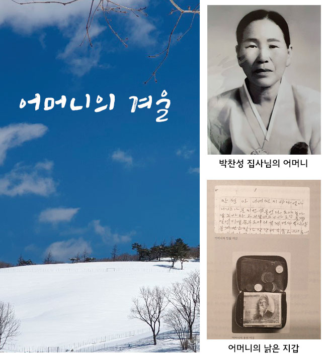 100원짜리 지폐 2장에 동전 몇 닢이 들어있던 어머니의 지갑은 지금까지 정성껏 보관하고 있다. 100원짜리 지폐가 혹 상할까 손수 만드신 비닐 봉투에 고이 넣고 다니셨으니 어떻게 그 돈을 쓰기나 하셨을까? 나는 가끔 어머니의 손때 묻은 지갑을 꺼내어 만져보면서 작은 돈까지 그렇게도 귀하게 여기셨던 무언의 가르침을 마음에 새겨 보곤 한다. 가만히 눈을 감고 어머니 생전에 환하게 웃으시던 모습을 떠올리다가 나는 깜짝 놀랐다. 작은 금니가 살짝 드러나 보이던 어머니의 환한 미소 띤 얼굴이 떠오르지 않는다. 이것은 어머니의 겨울이 길고 추웠기 때문일까?