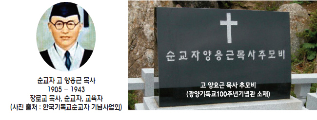 이같이 일본강점기 때 기독교 지도자들의 하나님 사랑은 민족 사랑으로 이어져 뜨거운 신앙심과 민족의식으로 언제나 백성들의 모범을 보였다. 양용근 목사 역시 신사참배를 반대한 불경죄로 체포되어 옥고를 치르다가 1943년 12월 5일 광주형무소에서 죽음을 맞았다.