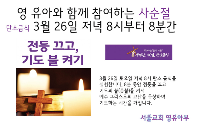 짧은 8분이지만 각 가정의 모든 전등을 소등함으로 탄소 발생을 줄여 지구의 기후 위기를 극복하고 사순절 주님의 고난과 하나님이 지으신 아름다운 창조 세계를 생각하며 기도하는 귀한 시간이 되기를 바랍니다.