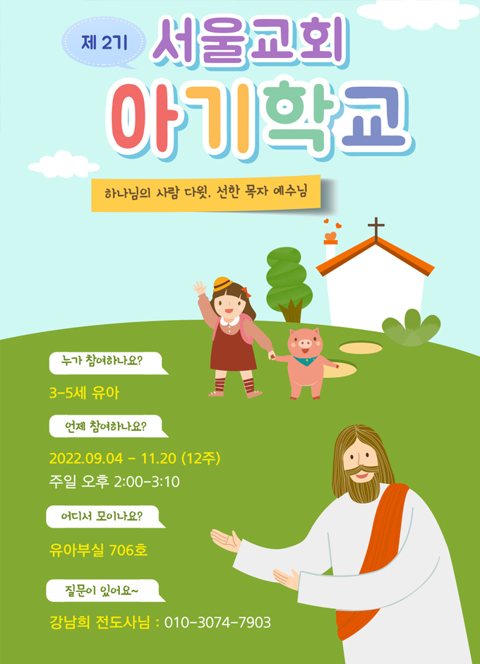 서울교회 아기학교 2기는 9월 4일 주일부터 12주 동안 706호(유아부실)에서 3부 예배시간에 진행됩니다. 주제는 “하나님의 사람 다윗(삼상 16:7)과 선한 목자 예수님(요10:11)”입니다. 먼저 4주간 구약 성경의 인물 다윗을 스타북을 통하여 만납니다. 하나님께서 사랑하시고, 찬양하고, 용감하고, 서로 사랑하는 다윗의 모습은 유아들의 좋은 모델이 됩니다. 신약의 선한 목자 예수님을 나머지 8주간 만납니다. 선한 목자는 양들을 지켜주고, 양의 이름을 알고 불러줍니다. 선한 목자는 양들의 문이 되어주고, 목숨을 내어 줍니다. 선한 목자는 예수님입니다. 선한 목자 예수님을 유아들이 원목 교구를 통하여 듣고, 만지고, 경험합니다. 유아들이 복음이신 예수님을 만납니다.