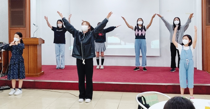 * 송미령 권사 : 워십 댄스로 만들 찬양곡 한 곡을 정한 후 가사를 초등부 5개 반에 단락별로 나눠 배분하면 반학생들이 가사에 맞는 포즈를 서로 토의와 연구하여 만든 후 찬양 시간에 각 반이 담당 가사에 맞게 만든 모션을 시연하면 다른 반들이 따라하는 형식입니다. 형태는 단순하지만 자신이 만든 율동이라 재밌어하고 있습니다.