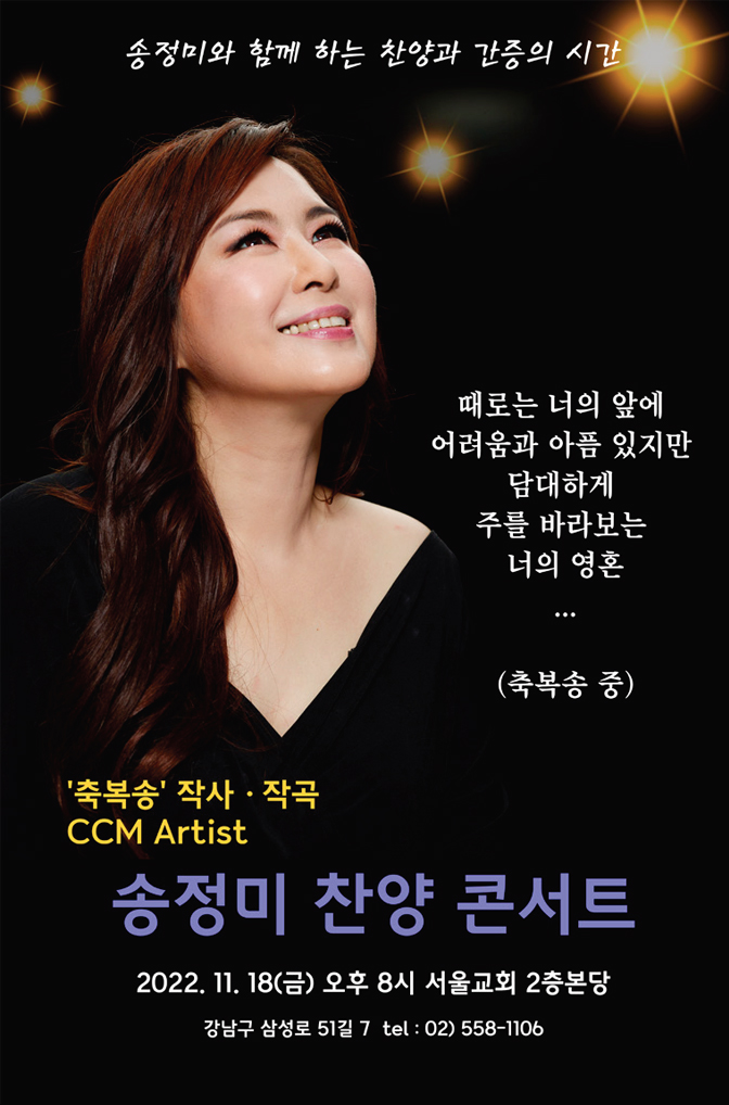 사명자대회본부(위원장 유충기 장로)는 2022 사명자대회의 일환으로 성도들을 위로 하고 새가족 초청의 기회를 가지고자 '송정미 찬양콘서트'를 11월 18일(금) 오후 8시에 본 당에서 개최한다.