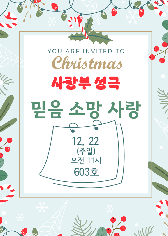 또한 이 연극에 출연하는 배우 김남희, 남단비, 소성일, 김은선, 김동선, 공성광, 송재원 학생 그리고 찬양 게스트 이준석 학생의 열연과 열창은 성탄의 계절에 예수님께 드리는 최고의 선물이 될 것입니다. 성도님들의 많은 관람이 사랑부 학생들에게 큰 힘이 됩니다.