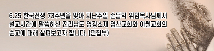 6.25 한국전쟁 당시 영광에서 194명의 기독교인이 순교했습니다. 순교자 대부분은 염산 지역의 염산교회와 야월교회 교인들로 특히 염산교회는 우리나라 최대의 기독교 순교지로 한국전쟁 당시 77명의 교인이 순교했습니다.
