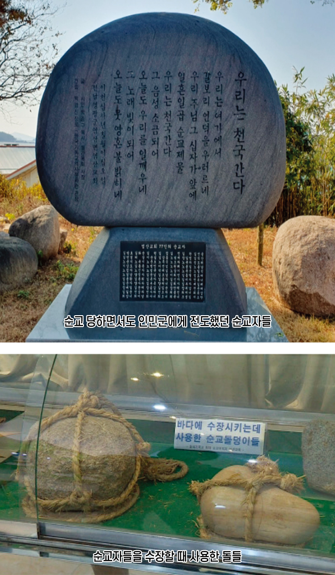 10월 3일부터 이듬해 1월 6일까지 약 3개월의 시간을 거쳐 순교했는데 그 기간이면 피난 갈 수 있는 충분한 시간이었지만 성도들은 교회를 지켰다고 합니다. 대부분의 순교자들은 새끼줄로 엮은 돌을 매단 채 교회 앞 바닷가로 끌려가 수장 당했습니다.