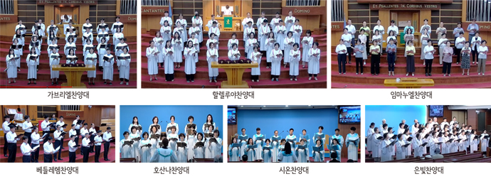 19일 월요일 새벽 5시 가브리엘찬양대의 '주님을 찬송하라'를 시작으로, 화요일 할렐루야찬양대 '부흥', 수요일 임마누엘찬양대 '은혜의 찬양', 목요일 은빛찬양대 '아! 내 맘속에', 금요일 호산나찬양대와 시온찬양대의 '주 하나님 지으신 모든 세계', 토요일 베들레헴찬양대 '믿는 사람들아 군병 같으니'까지 주관 찬양대원의 헌신으로 홍해를 건너는 모든 성도들에게 하나님의 군악대 같은 역할을 잘 감당하여 성공적인 홍해작전이 되어서 모두가 홍해를 건너는 기적이 있기를 소망합니다.