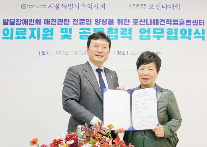호산나대학(학장 이동귀)은 2일 서울특별시수의사회(회장 최영민)와 발달장애인의 애견관련 전문인 양성을 위한 호산나애견직업훈련센터 의료지원 및 공동협력을 위해 업무 협약(MOU)을 체결했다고 밝혔다.