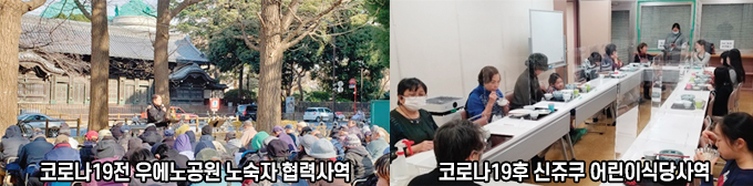 코로나 전에는 우에노 공원에서 설교 봉사와 식사 봉사 협력 사역을 하였습니다만, 코로나19 이후로 우에노 공원에 노숙자 사역이 도시락만 나누어주는 사역만 하여 코로나19에도 노숙자 식사를 하는 신쥬쿠 3쵸메 임마누엘무지개교회에서 매주 수요일 새벽 6시부터 8시까지 일본어 설교와 식사 배식 봉사 협력 사역을 하고 있으며 푸드뱅크에서 음식을 받아 노숙자 교회에 음식을 제공하는 협력 사역을 하고 있습니다.