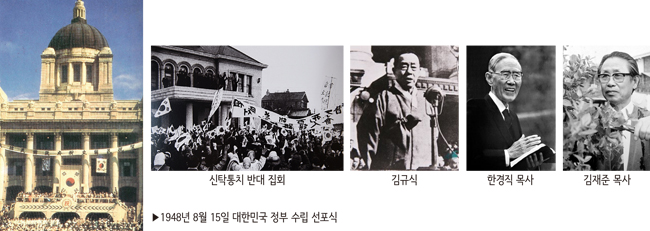 당연히 한국교회도 기독교의 신앙 위에 세워지는 나라를 꿈꾸었다. 초기부터 한국교회에는 신앙과 애국이 분리되지 않는 전통이 있었기에 교회가 건국에 깊은 관심을 가지고 기독교적 건국이념을 제시하는 것은 자연스러운 일이었다. 이런 기독교 건국론을 설파한 대표적인 인사는 김재준과 한경직으로 이들은 탁월한 외교적?정치적 감각을 갖춘 미국?캐나다 유학파로 자유민주주의를 지지하는 반공주의 성향의 목회자였다.