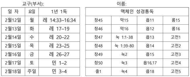 1년에 구약 1독, 신약과 시편 2독을 하는 맥체인방식 성경읽기표를 함께 게재합니다