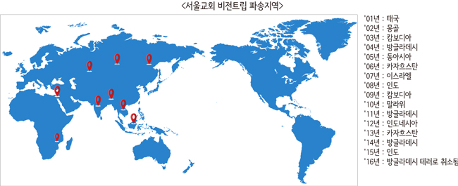 그 이후 2015년까지 매년 9개국에 15회에 걸쳐 비전트립팀을 파송하였으며 2016년에는 비전트립 파송 지역이었던 방글라데시 다카에 IS의 테러로 인한 치안 불안 등의 문제로 취소되었습니다. 당시 현지 선교사의 보고에 의하면 테러범과 단체를 색출하기 위해 방글라데시 정부는 약 12,000여 명을 검거하였고 외국인 출입국 통제가 강화되고 있는 상황이었으므로 2016 방글라데시 비전트립팀(팀장:정치은 안수집사)은 출발도 못하고 2016년 7월 9일(토) 해단식을 가졌습니다.