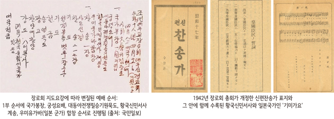 먼저 찬송가와 성서가 ‘개정’되었다. 1942년 찬송가의 가사 삭제와 수정이 어느 정도 마무리되자 장로회 총회는 “신편찬송가 정정 사용 주지의 건”이라는 공문을 내려 보냈다. 1943년에는 ‘수정판 찬송가’가 출판되었다. 이 새 찬송가의 앞부분에는 일본 국가, 일본 국경일 노래들, ‘황국신민서사’가 수록되었다. 성서도 수난을 받았다. 1943년 4월에 조직된 ‘조선기독교 혁신교단’이 성서에서 유대 민족주의와 관련된 부분을 삭제하기 시작했다. 처음에는 출애굽기와 다니엘서, 요한계시록이 삭제되었고 시간이 지나면서는 신약의 사복음서를 제외한 모든 성서가 삭제되었다.