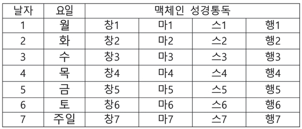 2024년부터 기존의 성경 순서대로 하는 성경일독 진도표에 더하여, 구약과 신약, 시편을 구속사적으로 연결해서 1년에 구약 1독, 신약과 시편 2독을 하는 맥체인 방식 성경읽기표가 게시됩니다. 기존의 성경일독 진도는 다음주부터 시작됩니다.