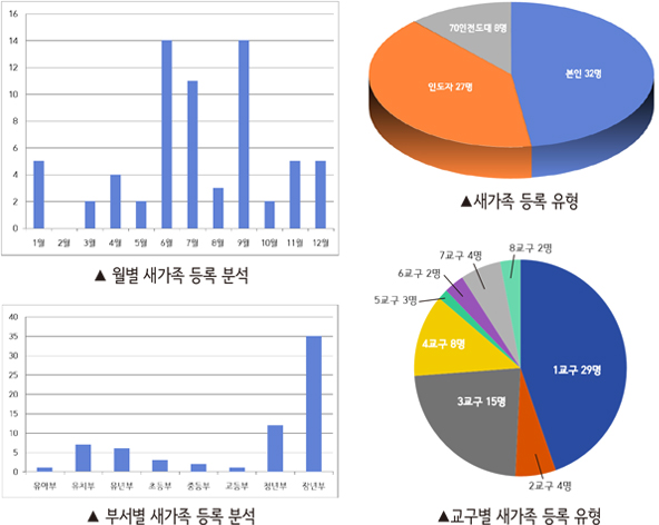 옆의 그래프는 주보기준으로 2023년에 등록한 새가족을 분석한 현황입니다. 새가족은 총 67명으로, 그 중에 본인 등록이 32명(48%), 인도자 등록이 27명(40%), 70인전도대 등록이 8명(12%)입니다.